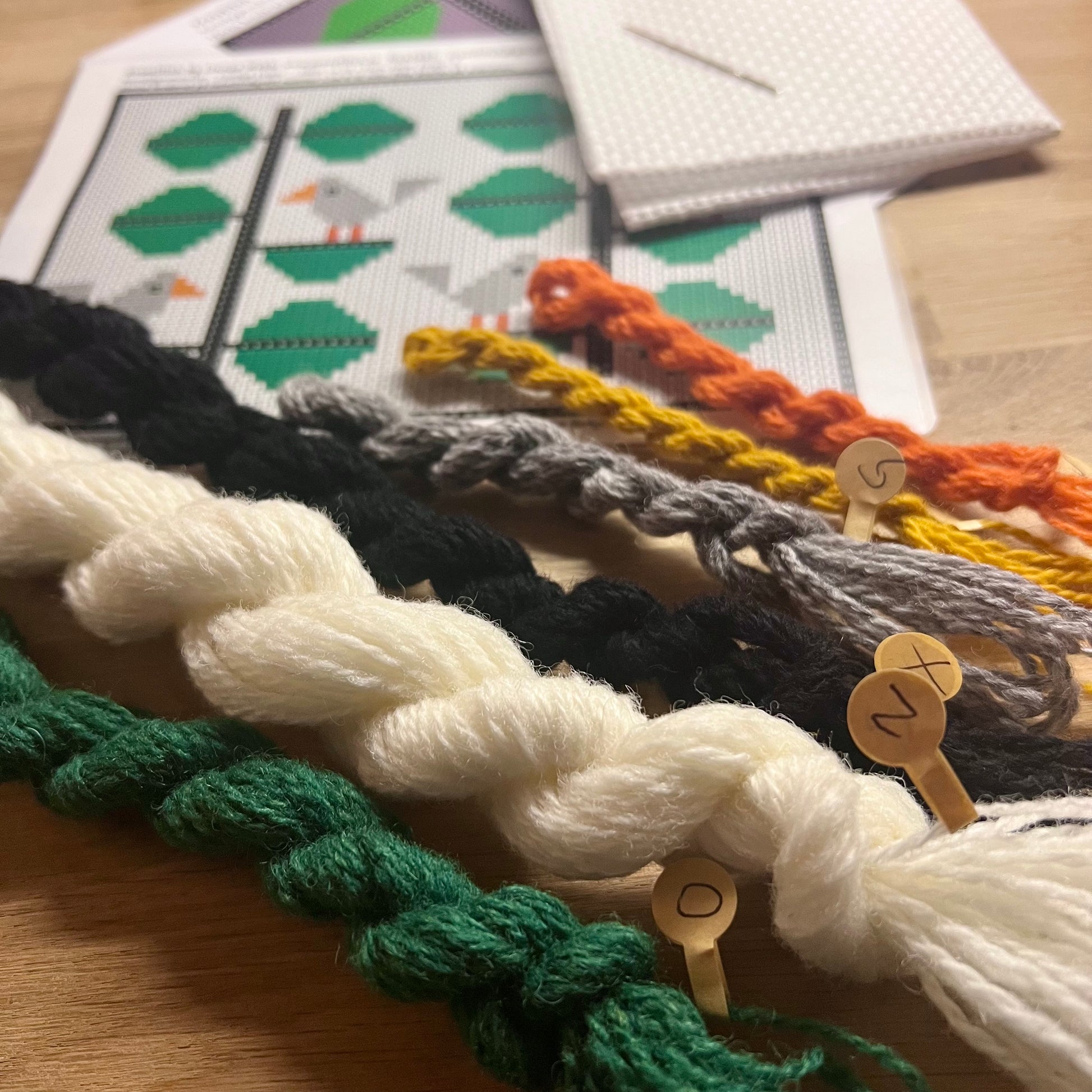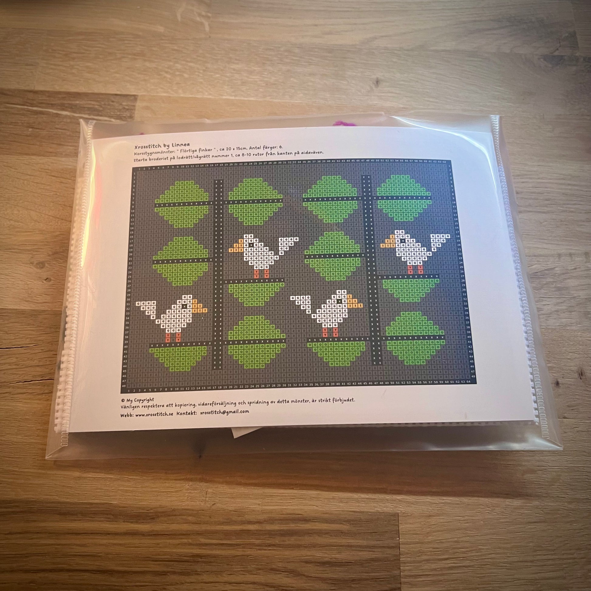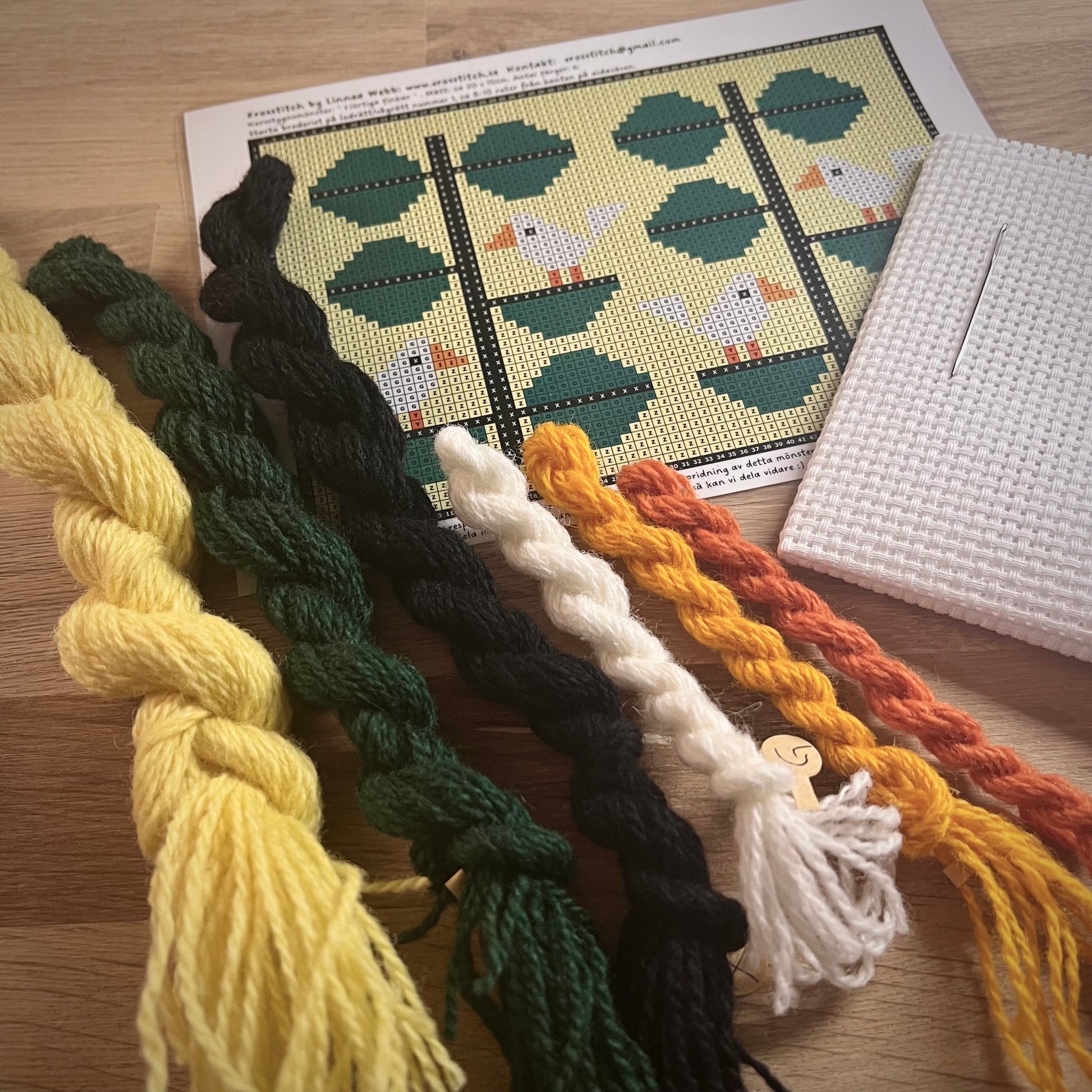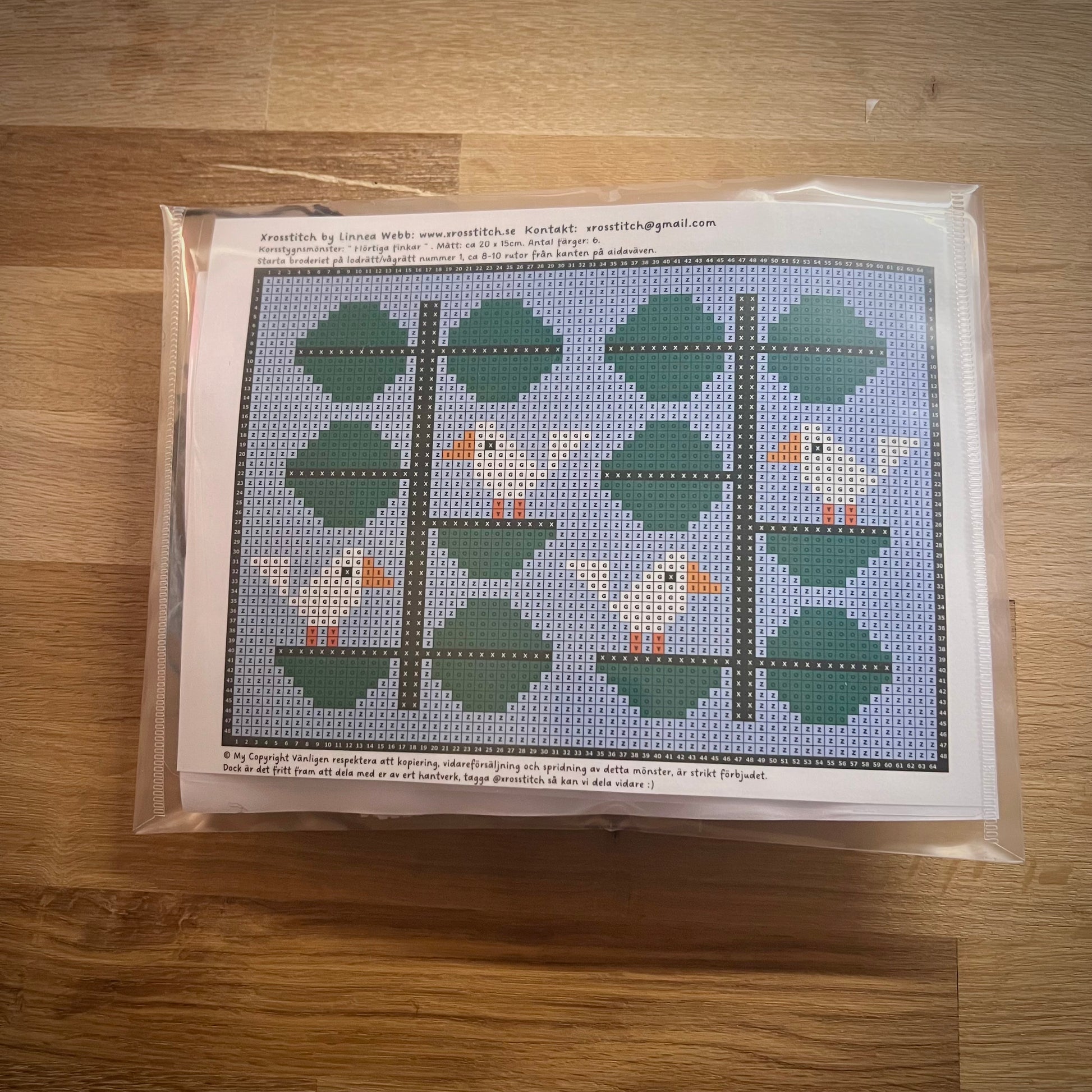 Broderikit med ullgarn ” flörtiga finkar ” 20x15cm