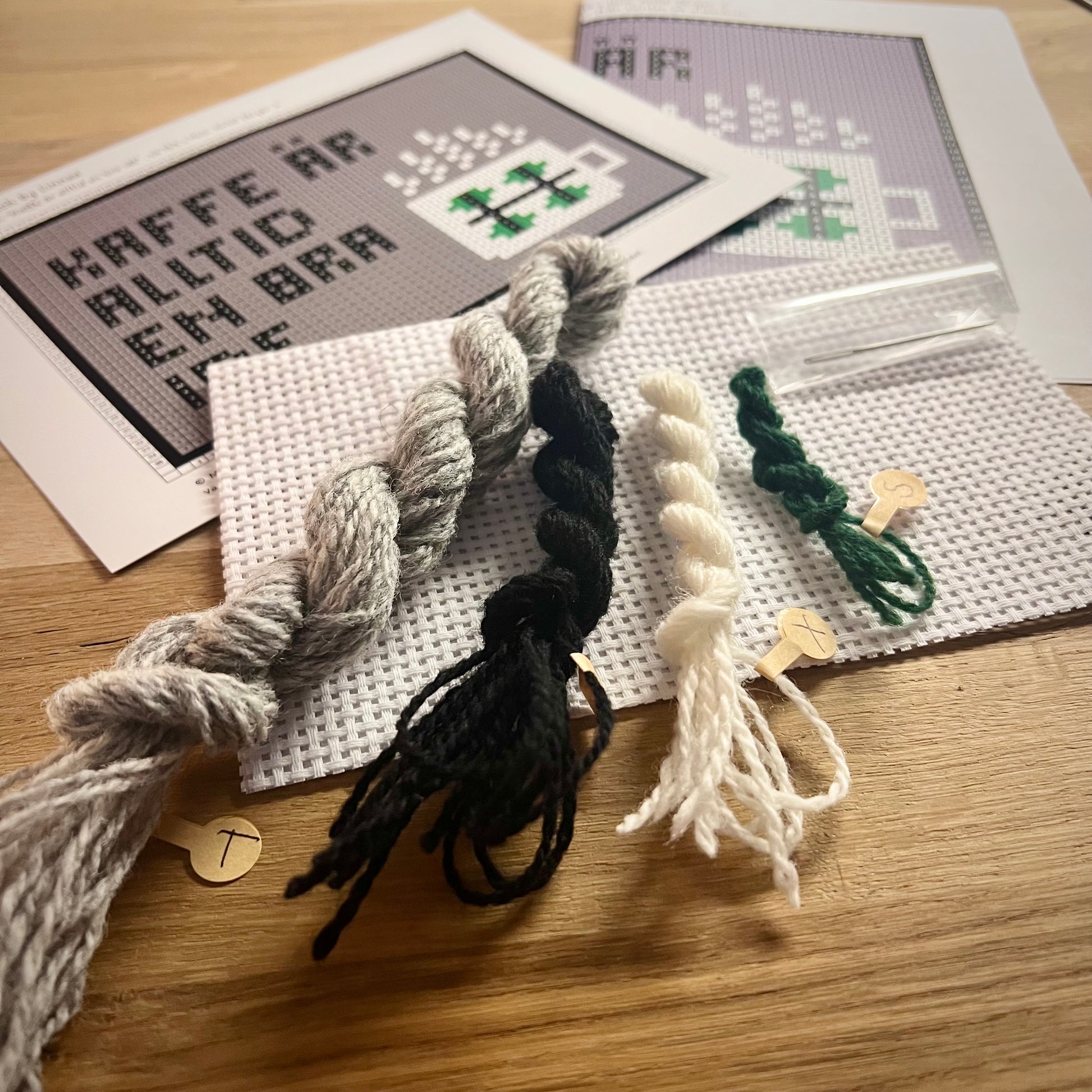 Ullbroderi kit med texten ”kaffe är alltid en bra ide”