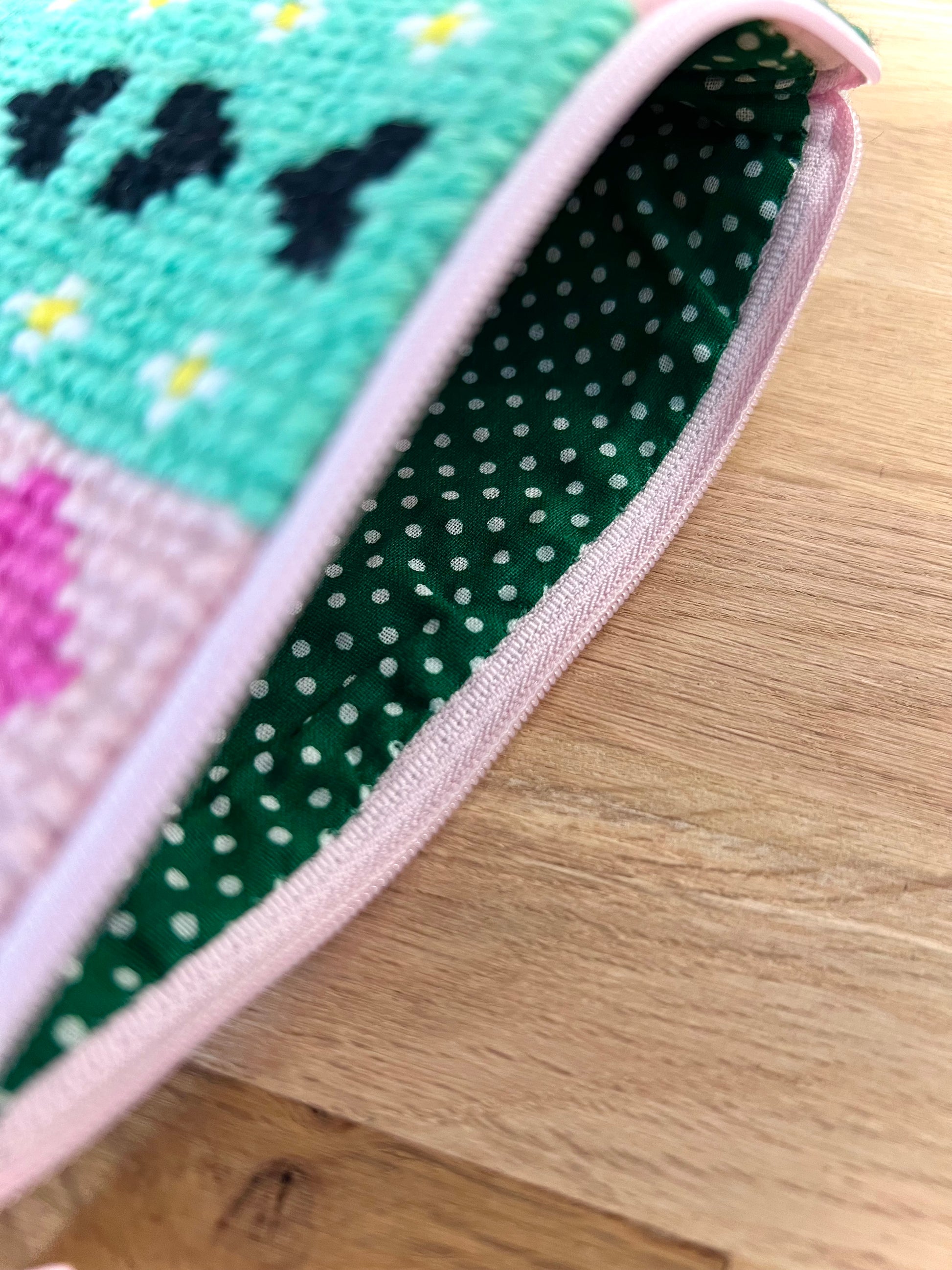 Handgjord unik börs, ”alla hjärtans dag” rosa/grön/gul 18,5x12cm