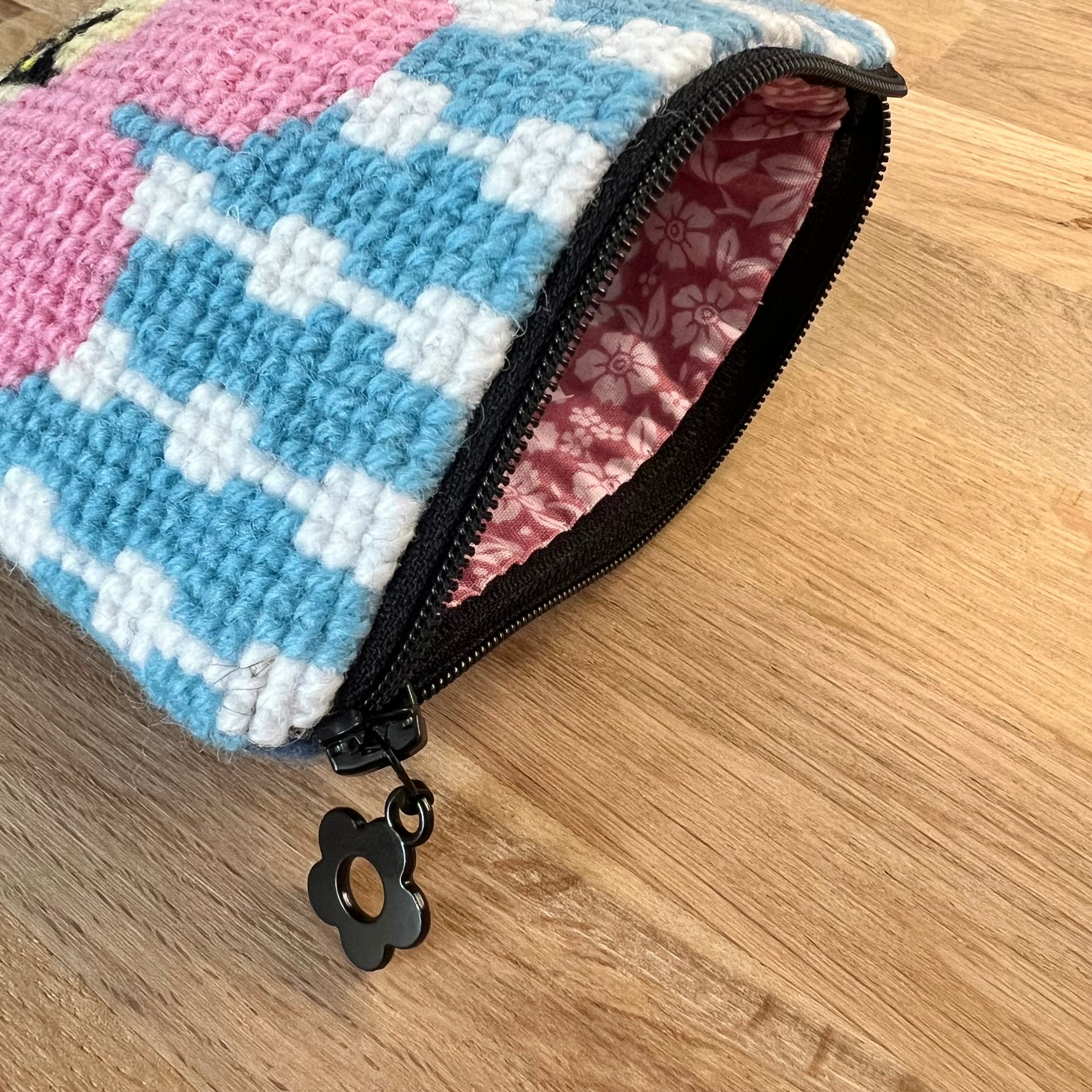 Handgjord unik börs, ”retrokatten” rosa/ljusblå